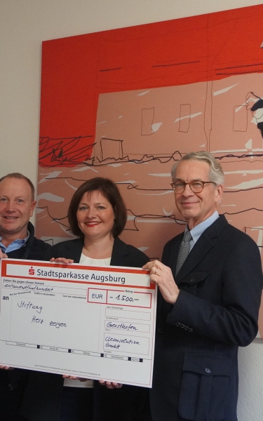Herr Stefan Brandmeyr und Frau Stefanie Ludwig von cleansolution GmbH bei der Scheckübergabe mit Herrn Christian Dierig (Vorsitzender des Stiftungskuratoriums) (v.l.n.r.)