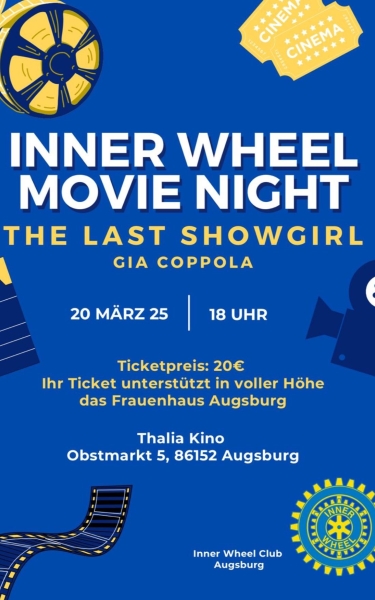 Der Inner Wheel Club Augsburg veranstaltet in Kooperation mit der VHS Augsburger Land e.V. am Donnerstag, dem 20. März 2025 um 18:00 Uhr eine besondere Filmvorführung im Thalia Kino Augsburg: "The last showgirl" von Gia Coppola, der Enkelin des legendären Regisseurs Francis Ford Coppola.